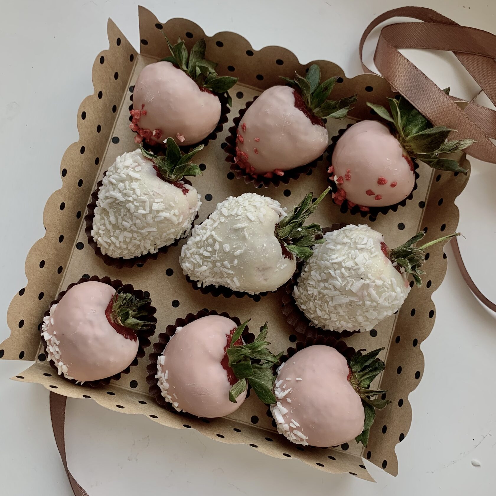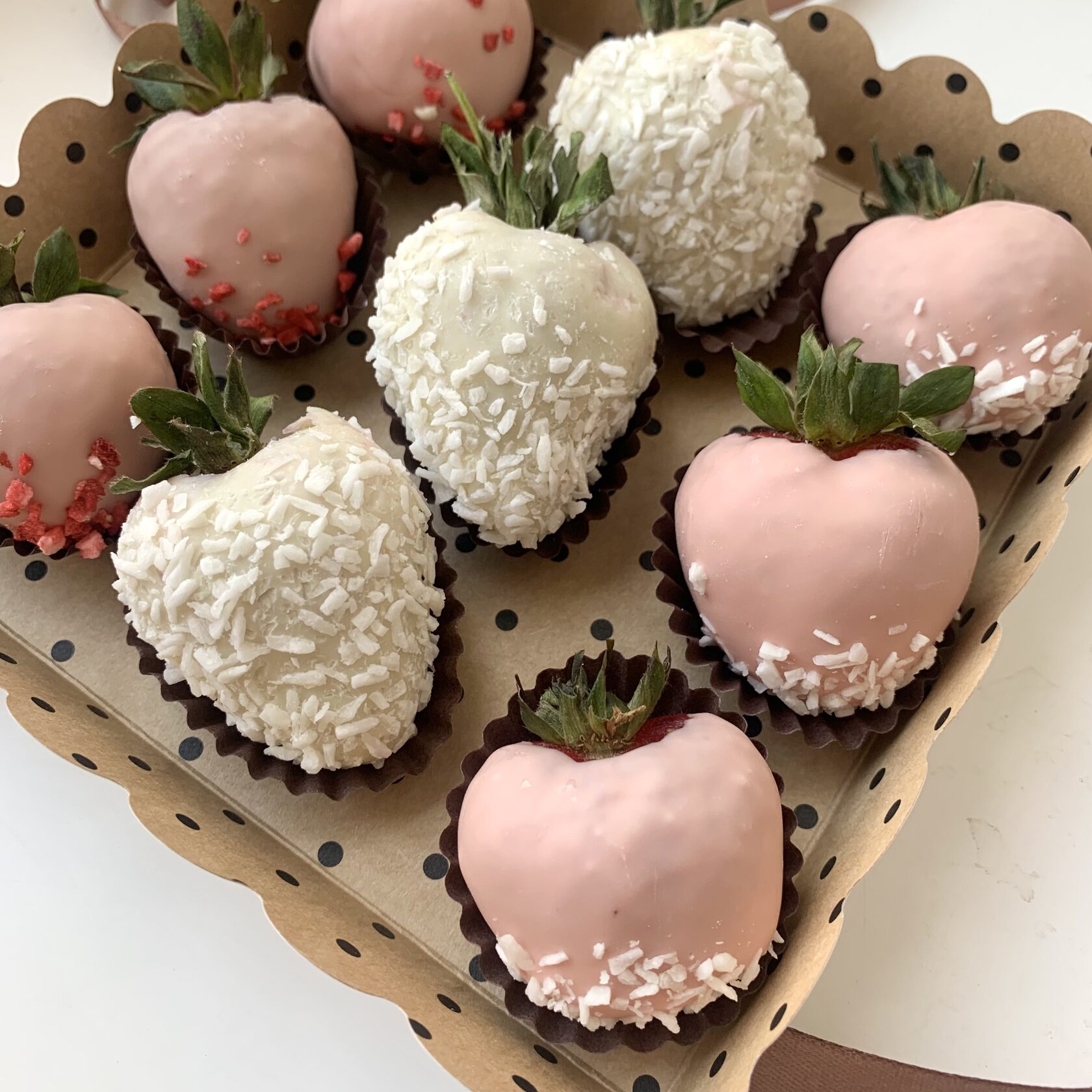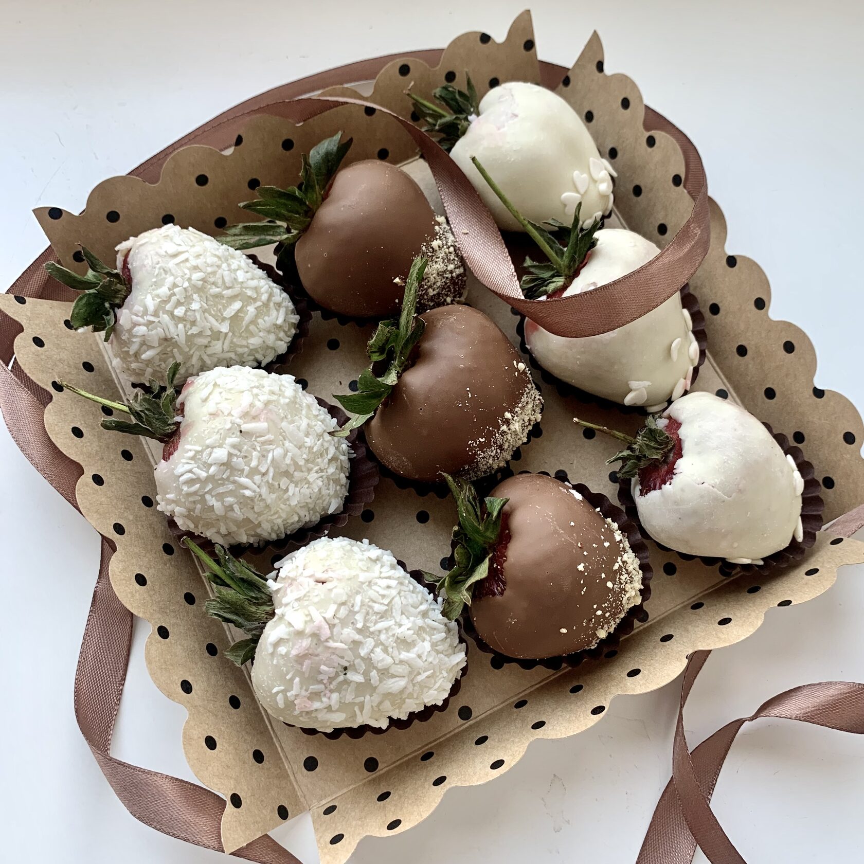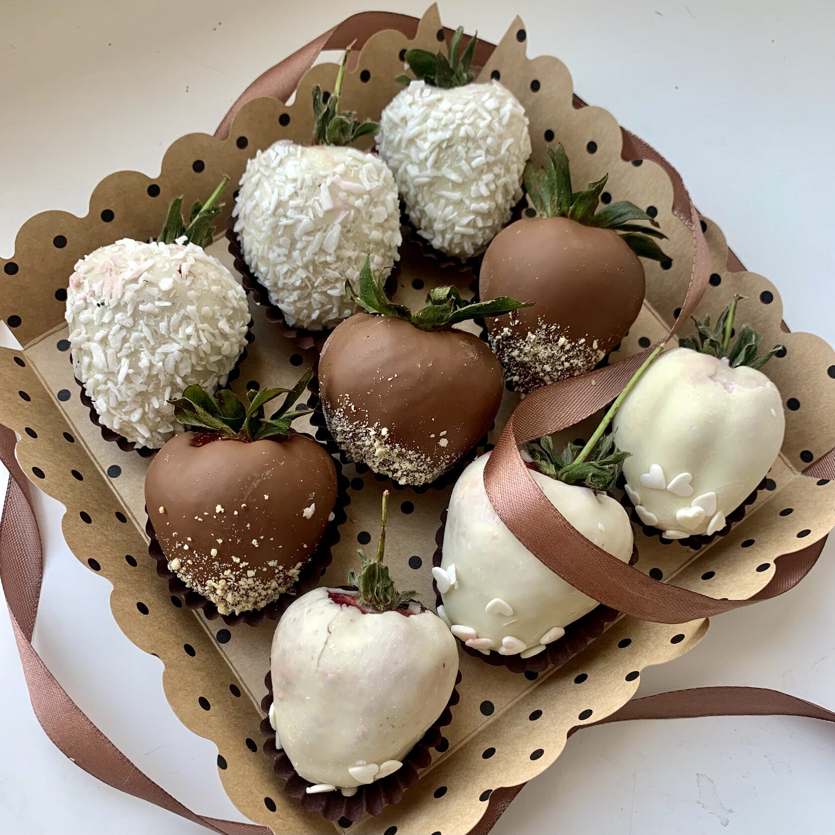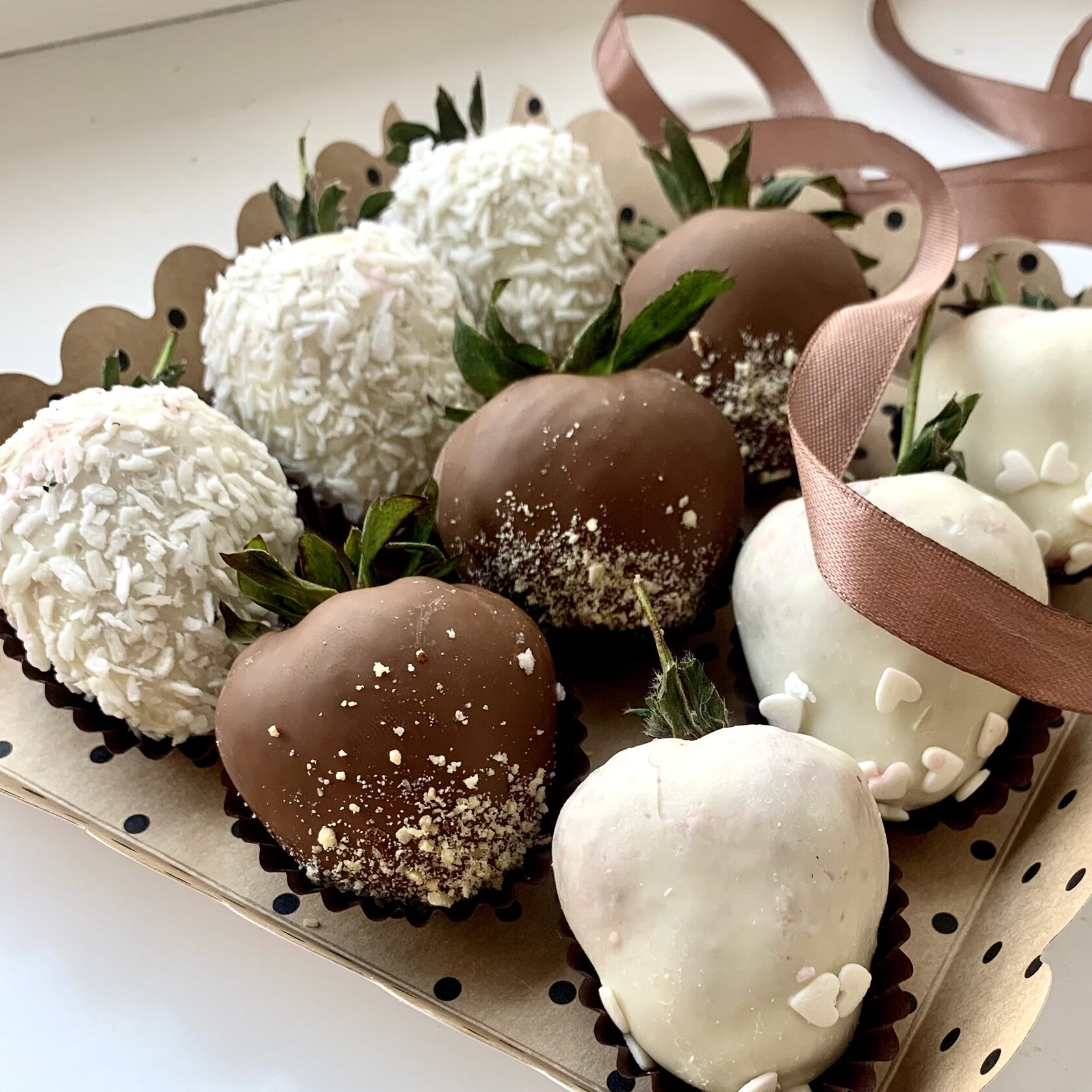 🍓в белом (с добавлением натурального гипоалергенного пищевого красителя) бельгийском шоколаде с кондитерской посыпкой (2 шт). 🍓в белом бельгийском шоколаде с кондитерской посыпкой (2 шт). 🍓в молочном бельгийском шоколаде с украшением из белого шоколада и кондитерской посыпки (2 шт). 🍓в молочном бельгийском шоколаде с дробленным орехом (2 шт). 🍓в белом молочном шоколаде с сублимированной клубникой и бананом (2 шт). 🍓в молочном бельгийском шоколаде с сублимированной клубникой и бананом (2 шт).