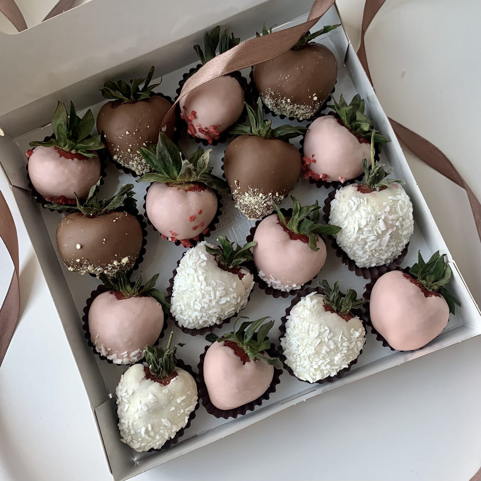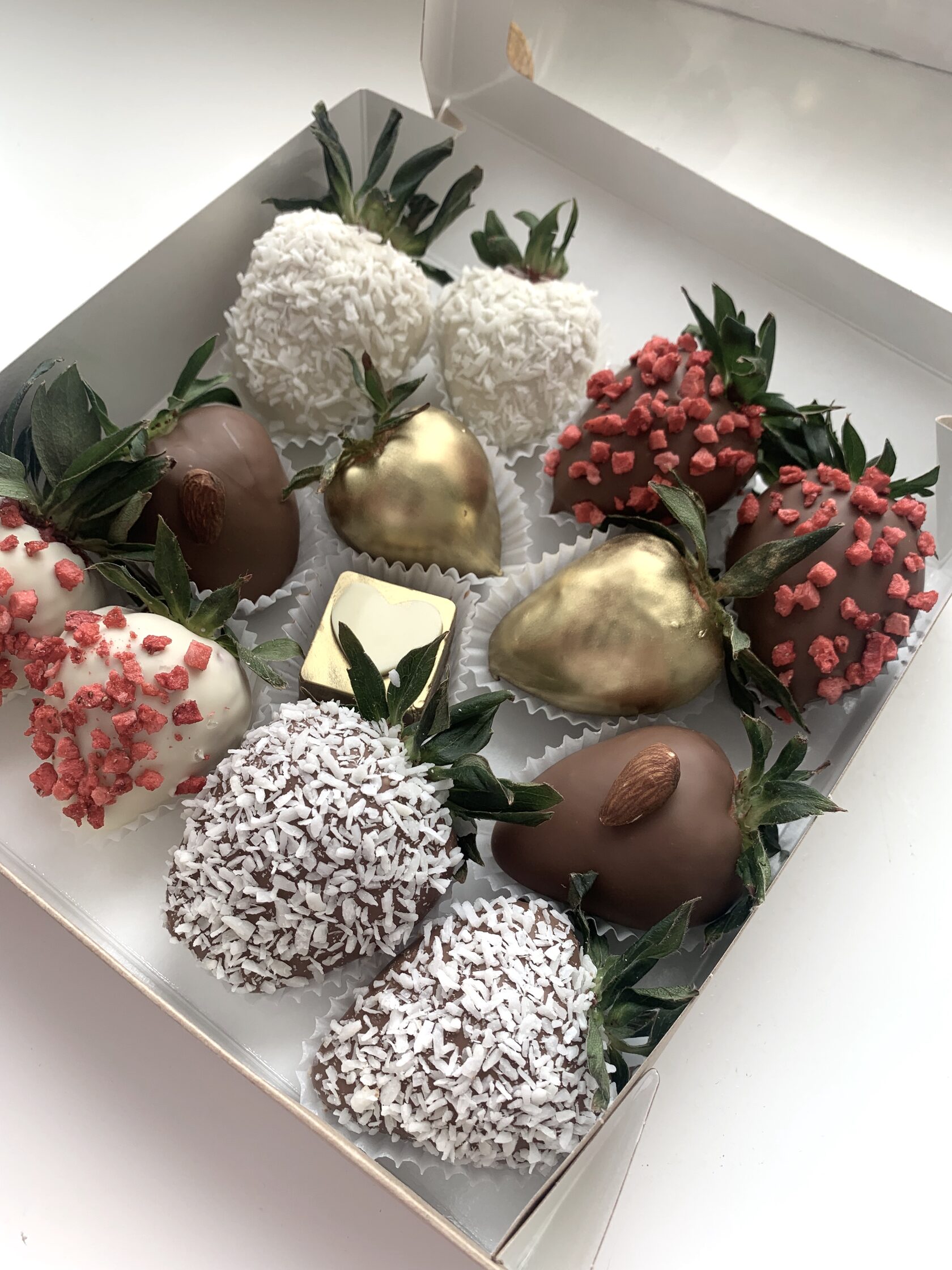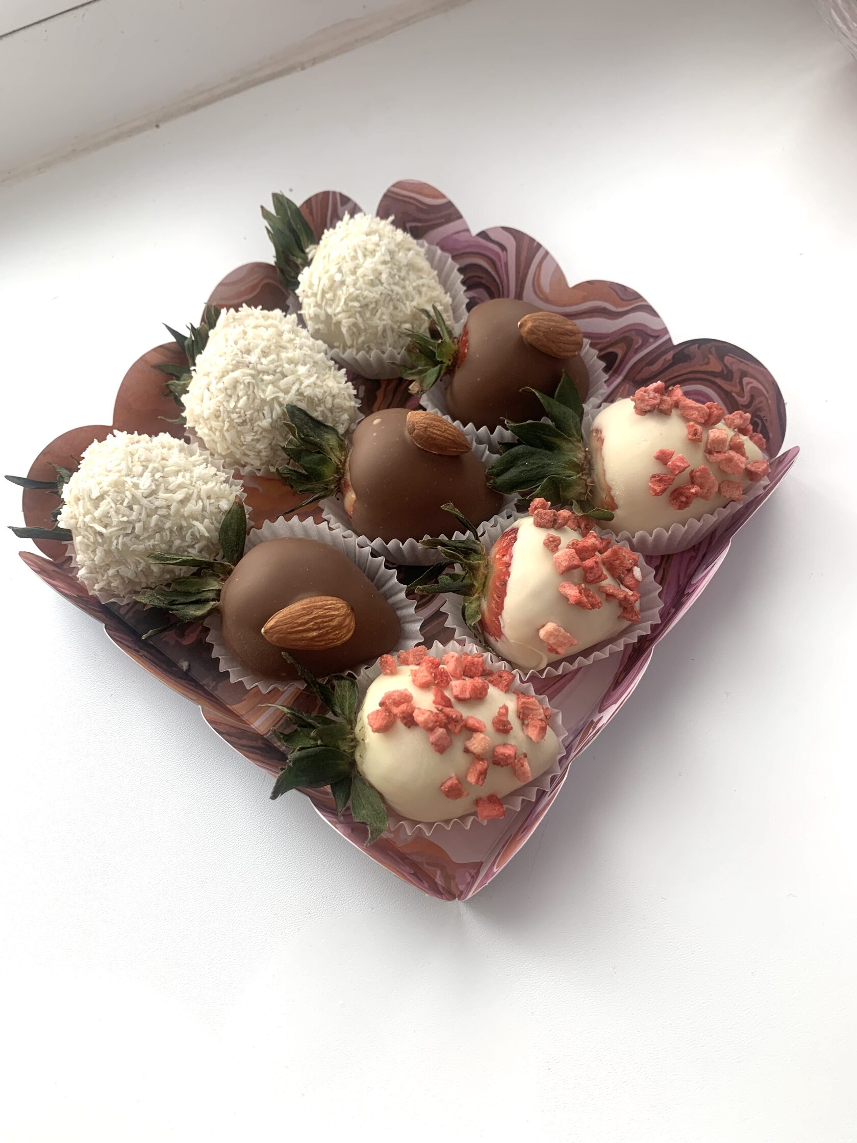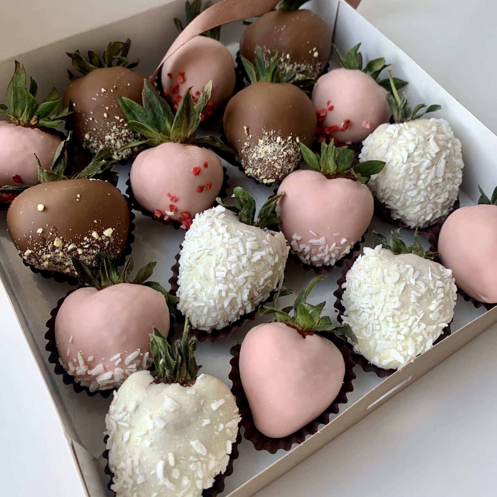 🍓в белом (с добавлением натурального гипоалергенного пищевого красителя) бельгийском шоколаде с кондитерской посыпкой (2 шт). 🍓в белом бельгийском шоколаде с кондитерской посыпкой (2 шт). 🍓в молочном бельгийском шоколаде с украшением из белого шоколада и кондитерской посыпки (2 шт). 🍓в молочном бельгийском шоколаде с дробленным орехом (2 шт). 🍓в белом молочном шоколаде с сублимированной клубникой и бананом (2 шт). 🍓в молочном бельгийском шоколаде с сублимированной клубникой и бананом (2 шт).