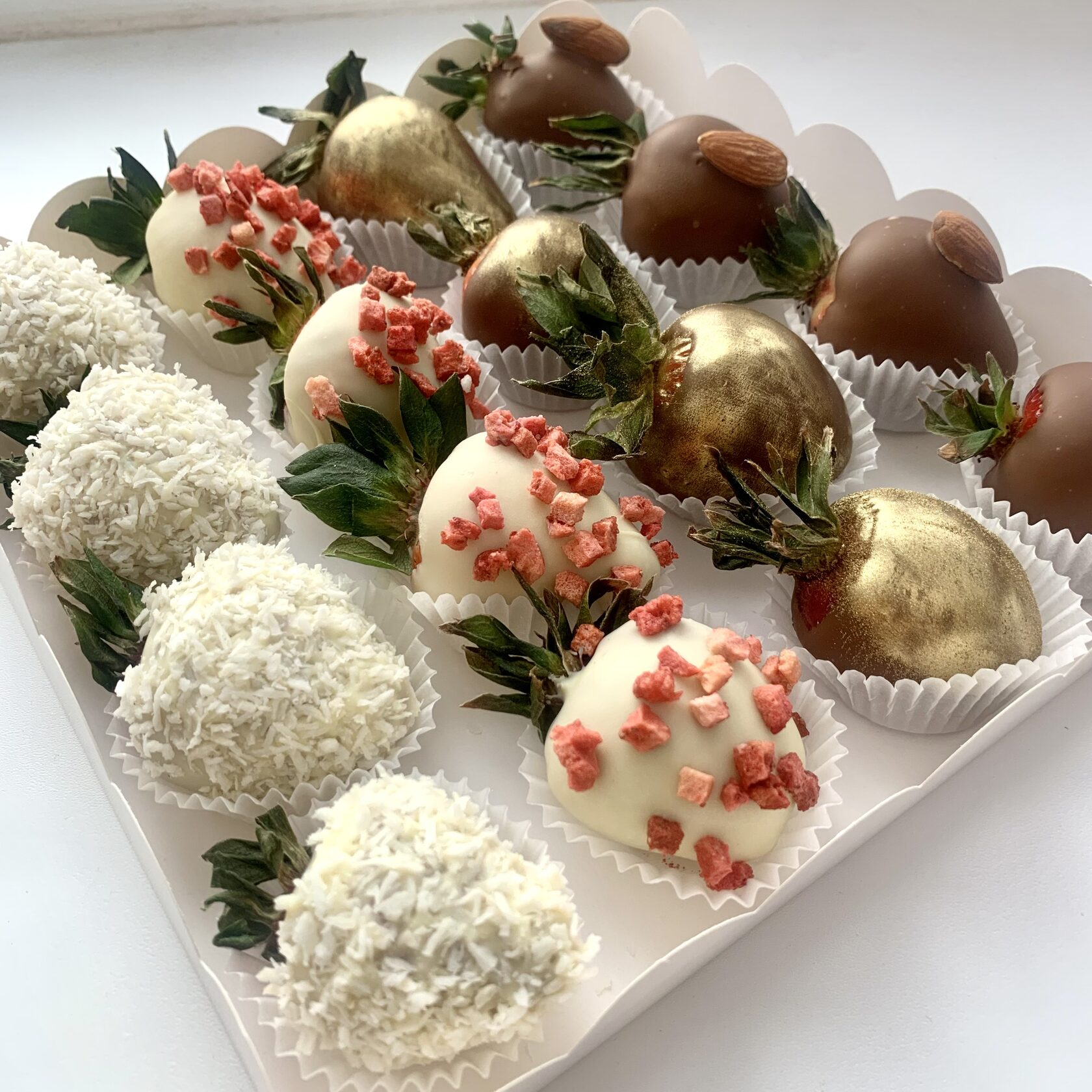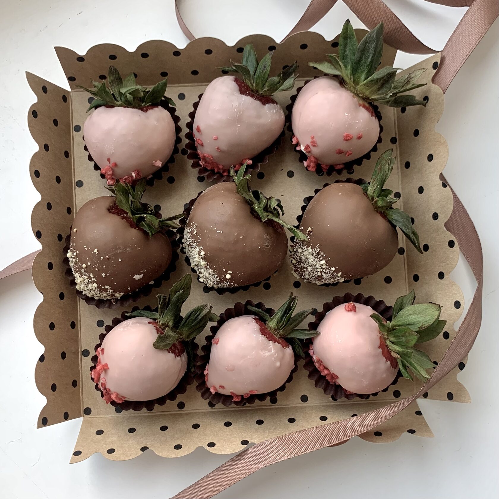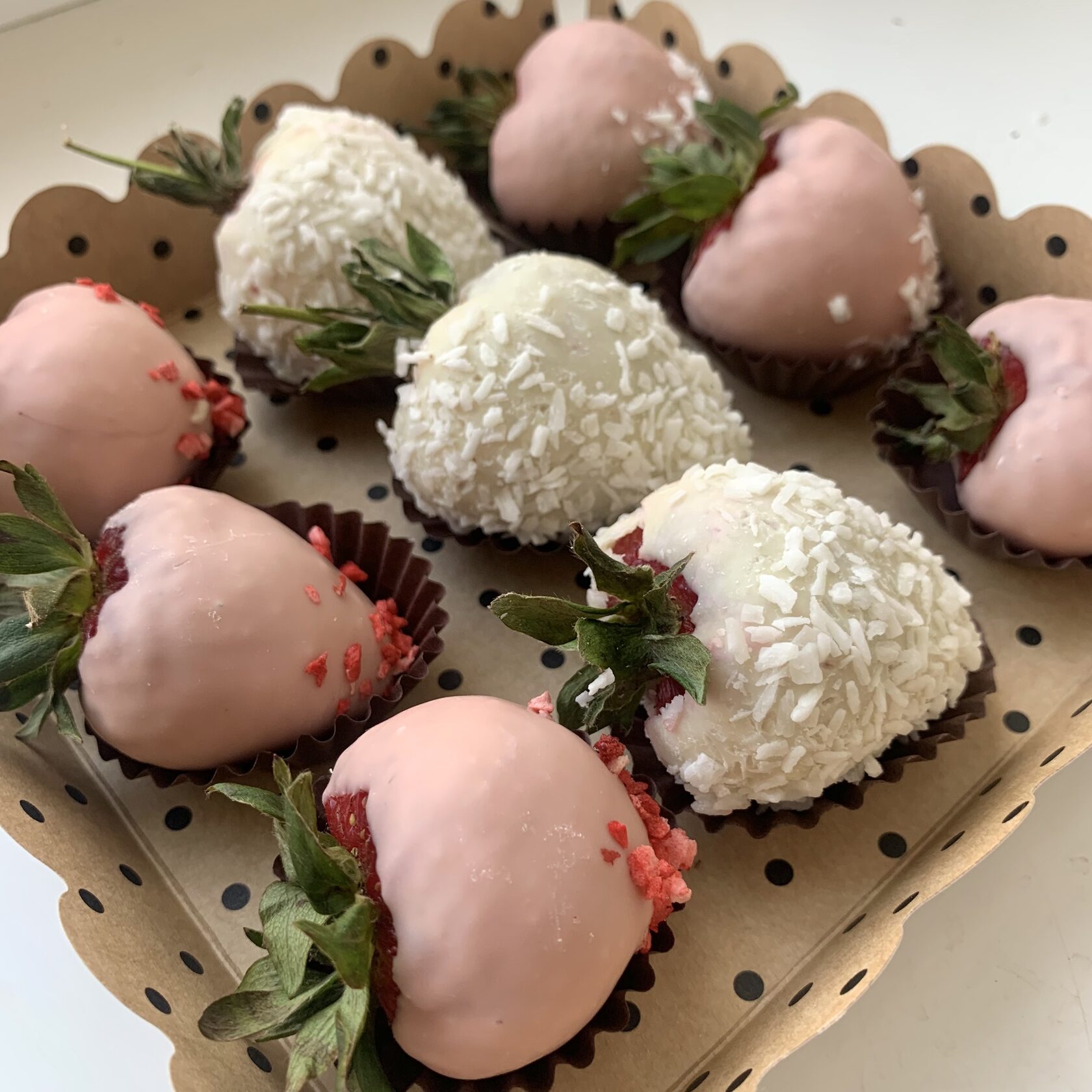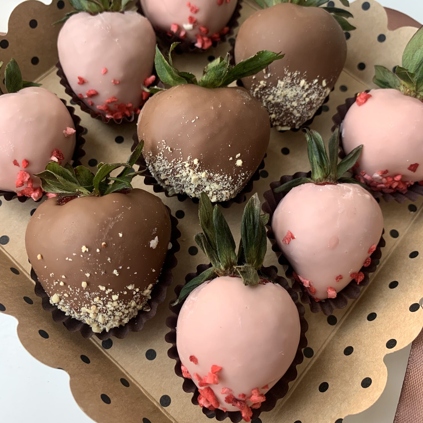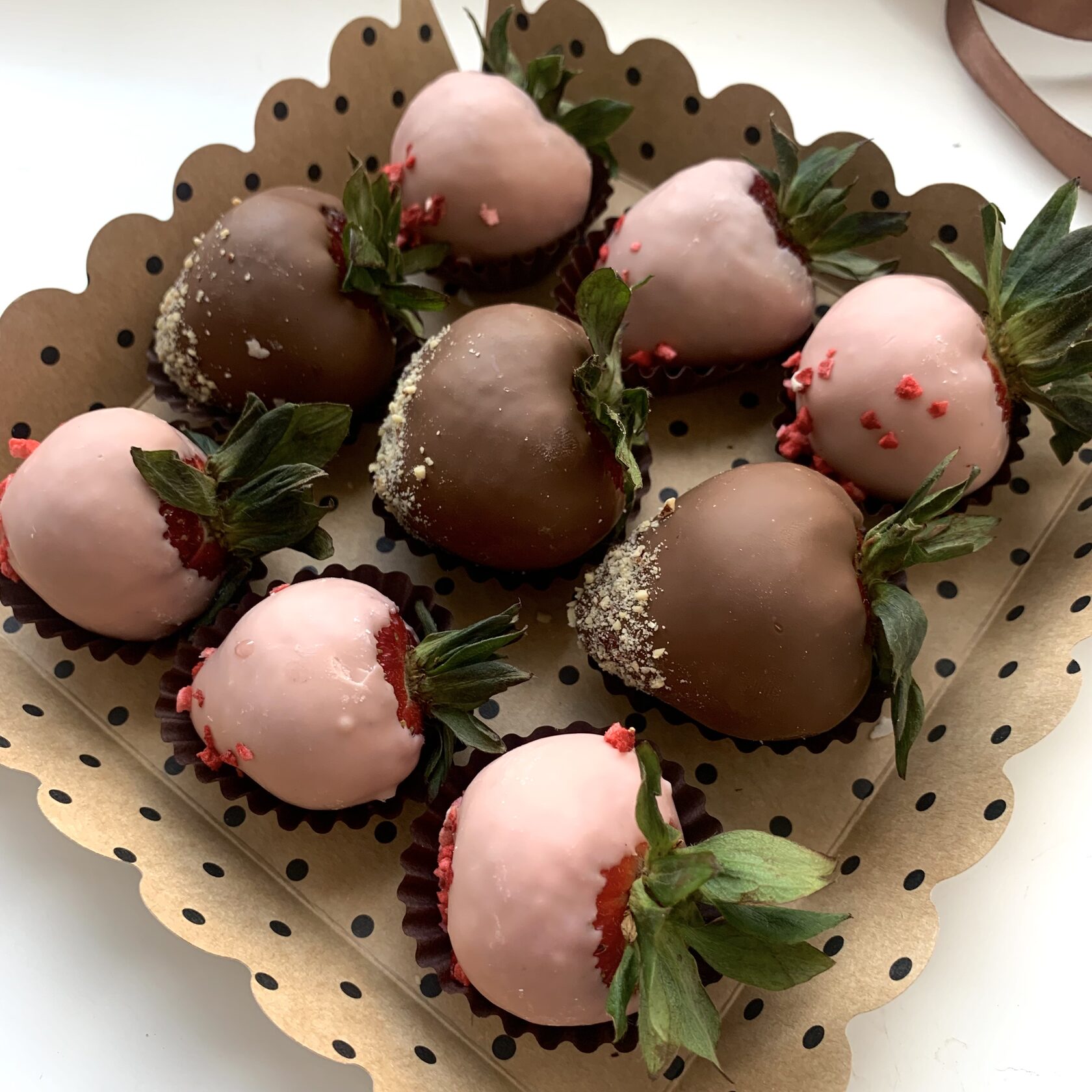 🍓в белом (с добавлением натурального гипоалергенного пищевого красителя) бельгийском шоколаде с кондитерской посыпкой (2 шт). 🍓в белом бельгийском шоколаде с кондитерской посыпкой (2 шт). 🍓в молочном бельгийском шоколаде с украшением из белого шоколада и кондитерской посыпки (2 шт). 🍓в молочном бельгийском шоколаде с дробленным орехом (2 шт). 🍓в белом молочном шоколаде с сублимированной клубникой и бананом (2 шт). 🍓в молочном бельгийском шоколаде с сублимированной клубникой и бананом (2 шт).