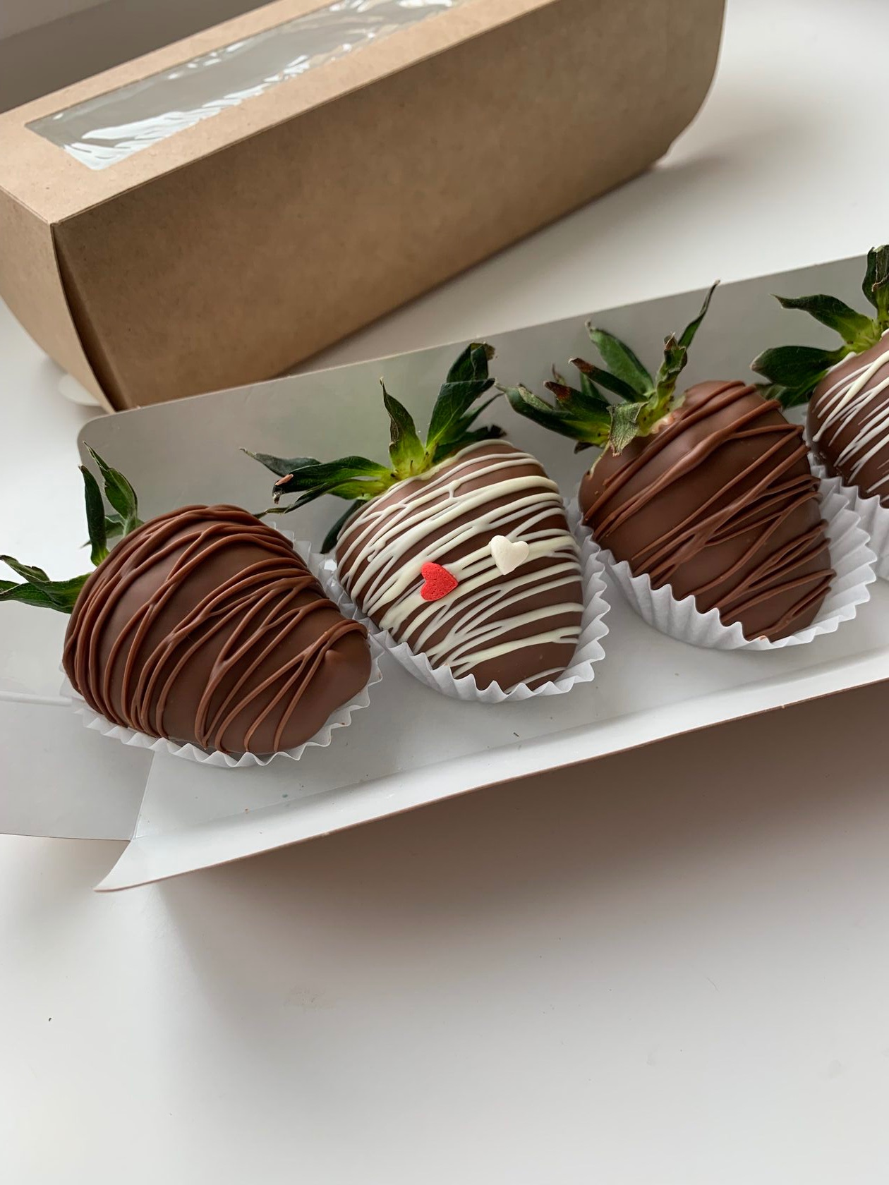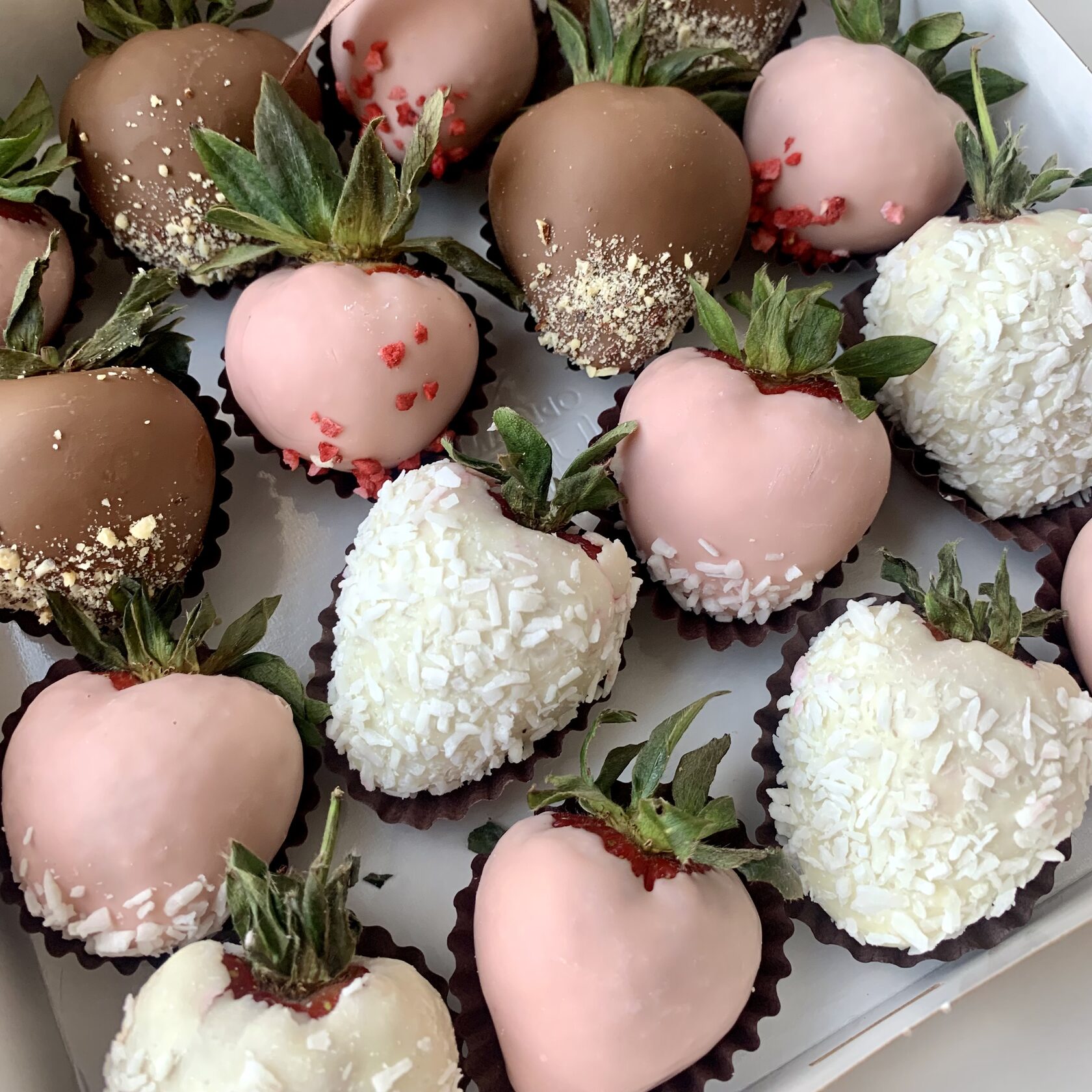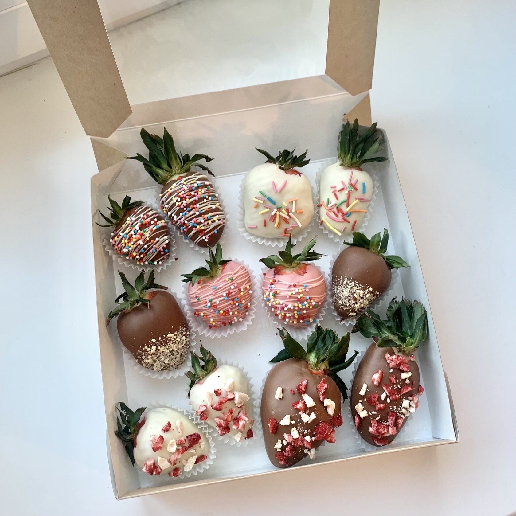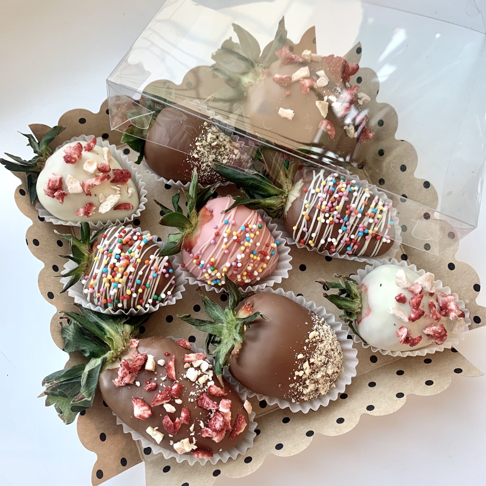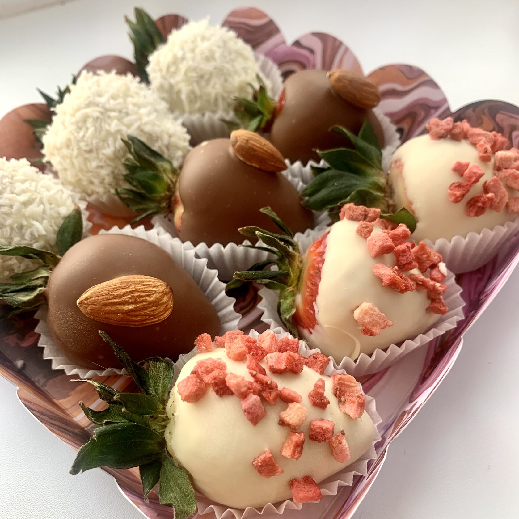 🍓в белом (с добавлением натурального гипоалергенного пищевого красителя) бельгийском шоколаде с кондитерской посыпкой (2 шт). 🍓в белом бельгийском шоколаде с кондитерской посыпкой (2 шт). 🍓в молочном бельгийском шоколаде с украшением из белого шоколада и кондитерской посыпки (2 шт). 🍓в молочном бельгийском шоколаде с дробленным орехом (2 шт). 🍓в белом молочном шоколаде с сублимированной клубникой и бананом (2 шт). 🍓в молочном бельгийском шоколаде с сублимированной клубникой и бананом (2 шт).