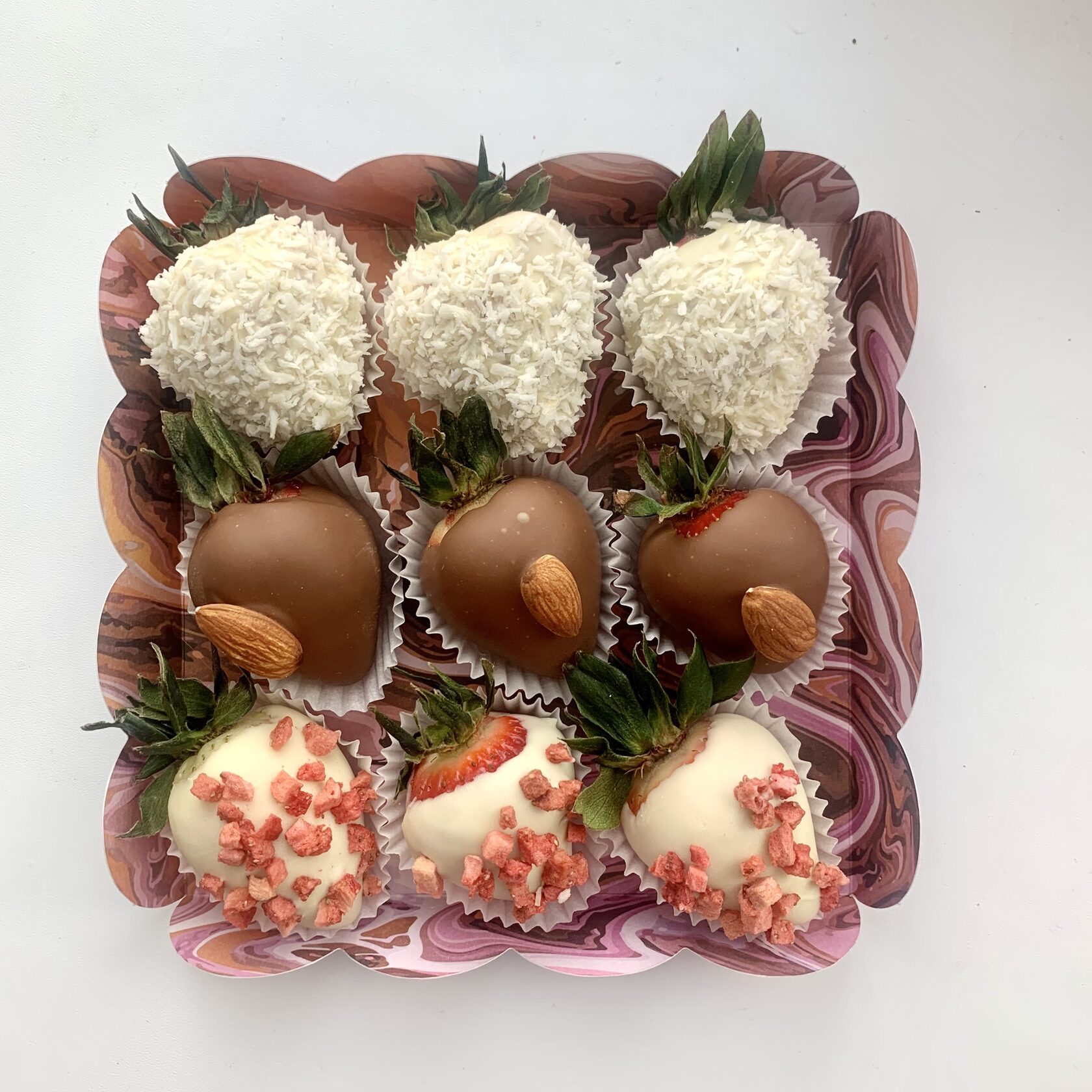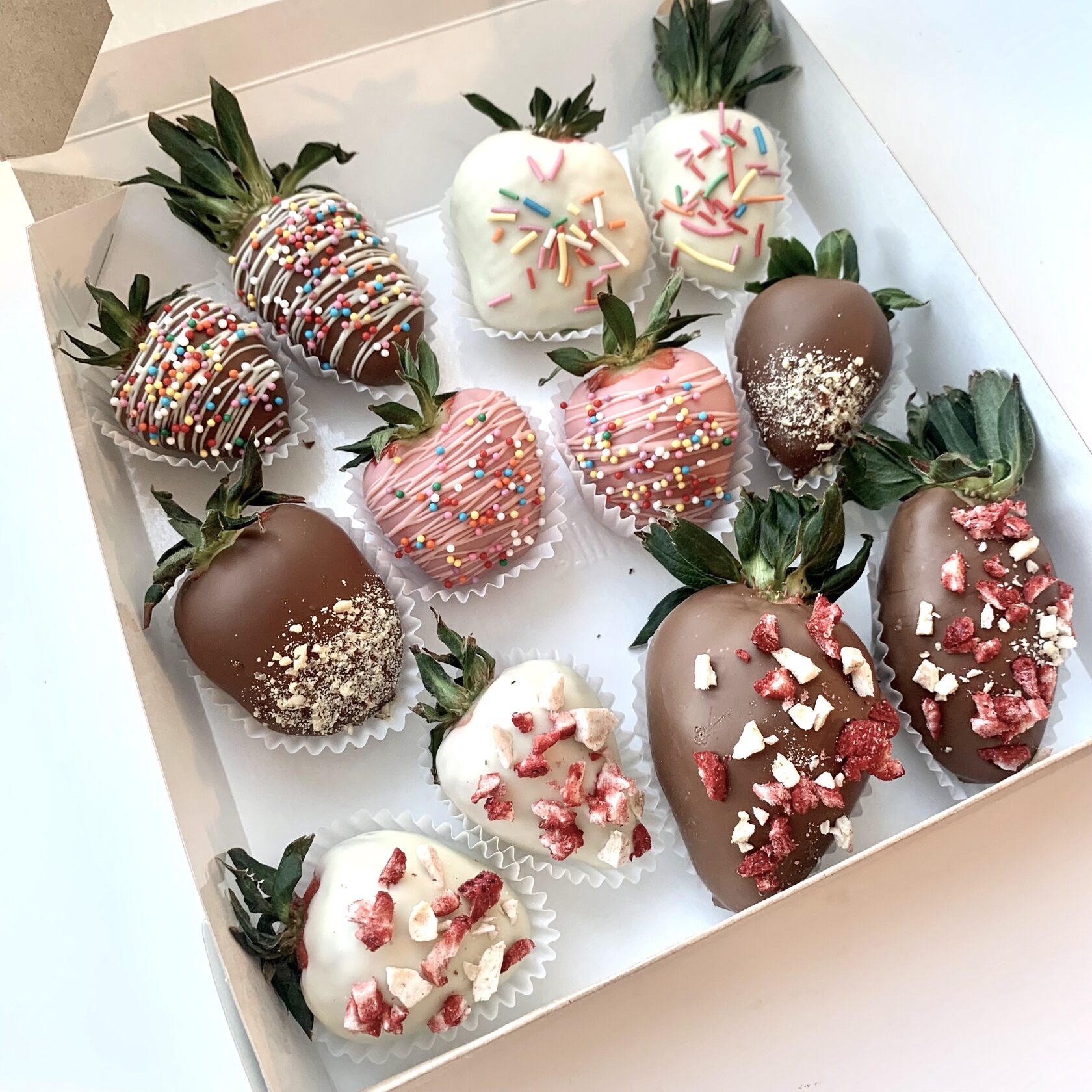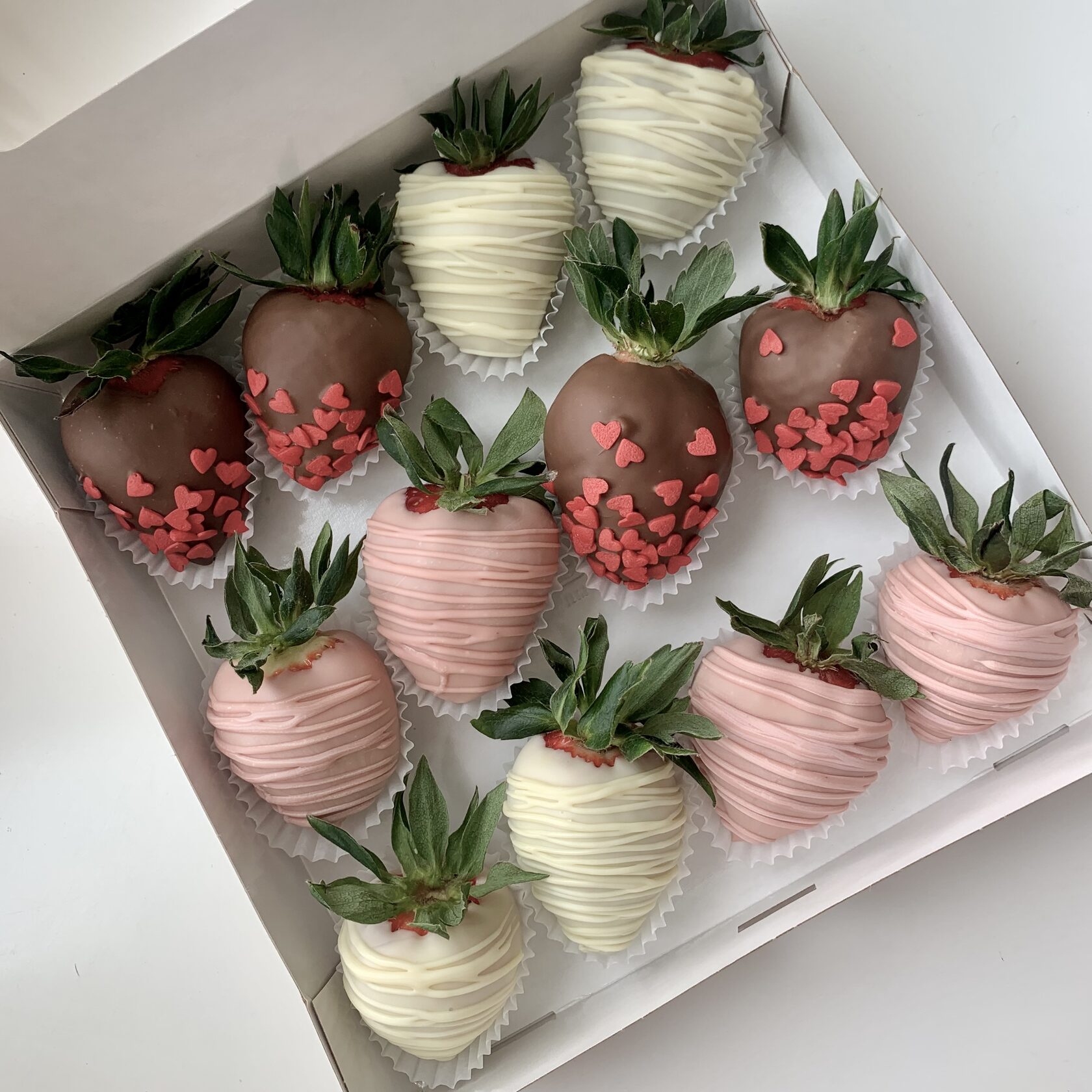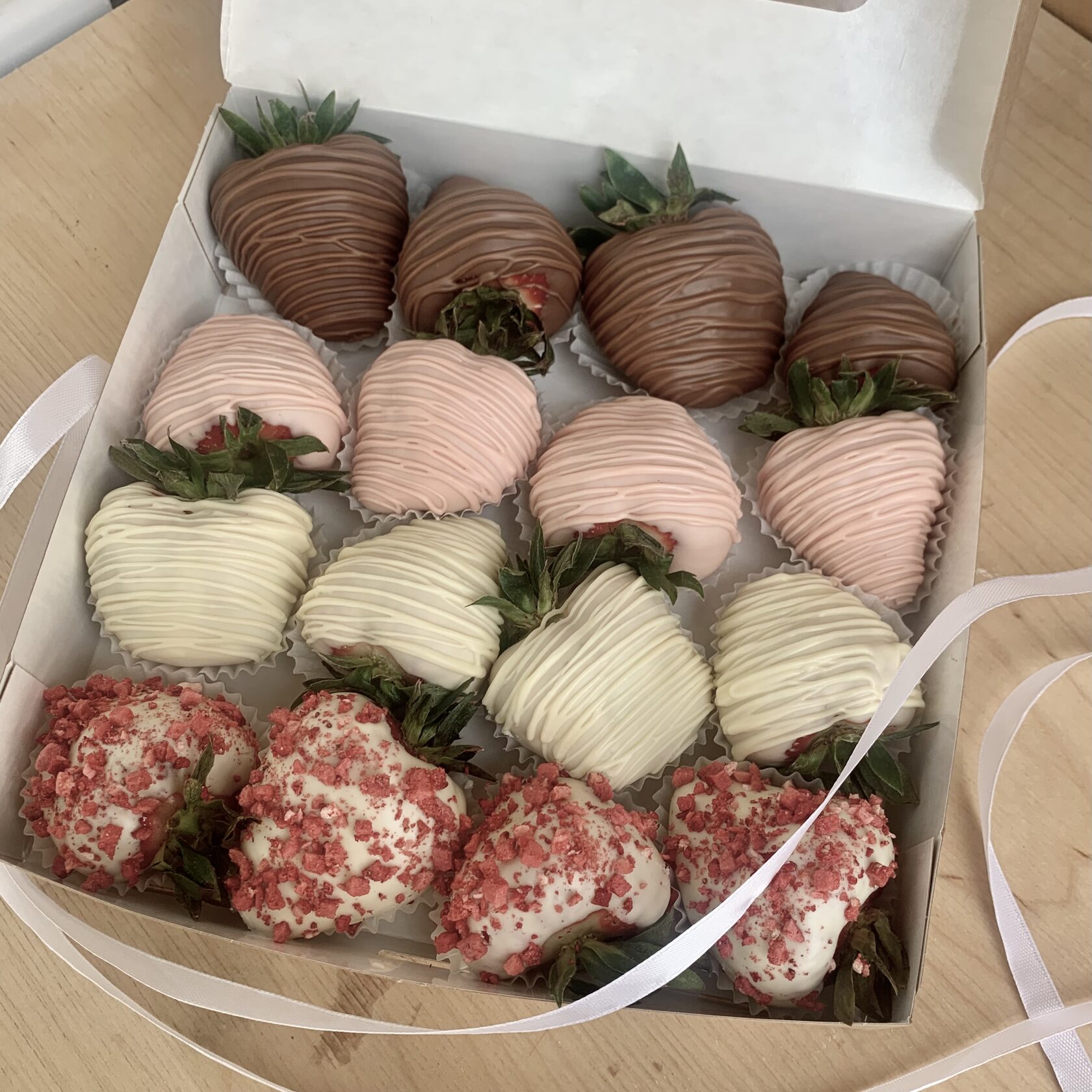 🍓в белом (с добавлением натурального гипоалергенного пищевого красителя) бельгийском шоколаде с кондитерской посыпкой (2 шт). 🍓в белом бельгийском шоколаде с кондитерской посыпкой (2 шт). 🍓в молочном бельгийском шоколаде с украшением из белого шоколада и кондитерской посыпки (2 шт). 🍓в молочном бельгийском шоколаде с дробленным орехом (2 шт). 🍓в белом молочном шоколаде с сублимированной клубникой и бананом (2 шт). 🍓в молочном бельгийском шоколаде с сублимированной клубникой и бананом (2 шт).