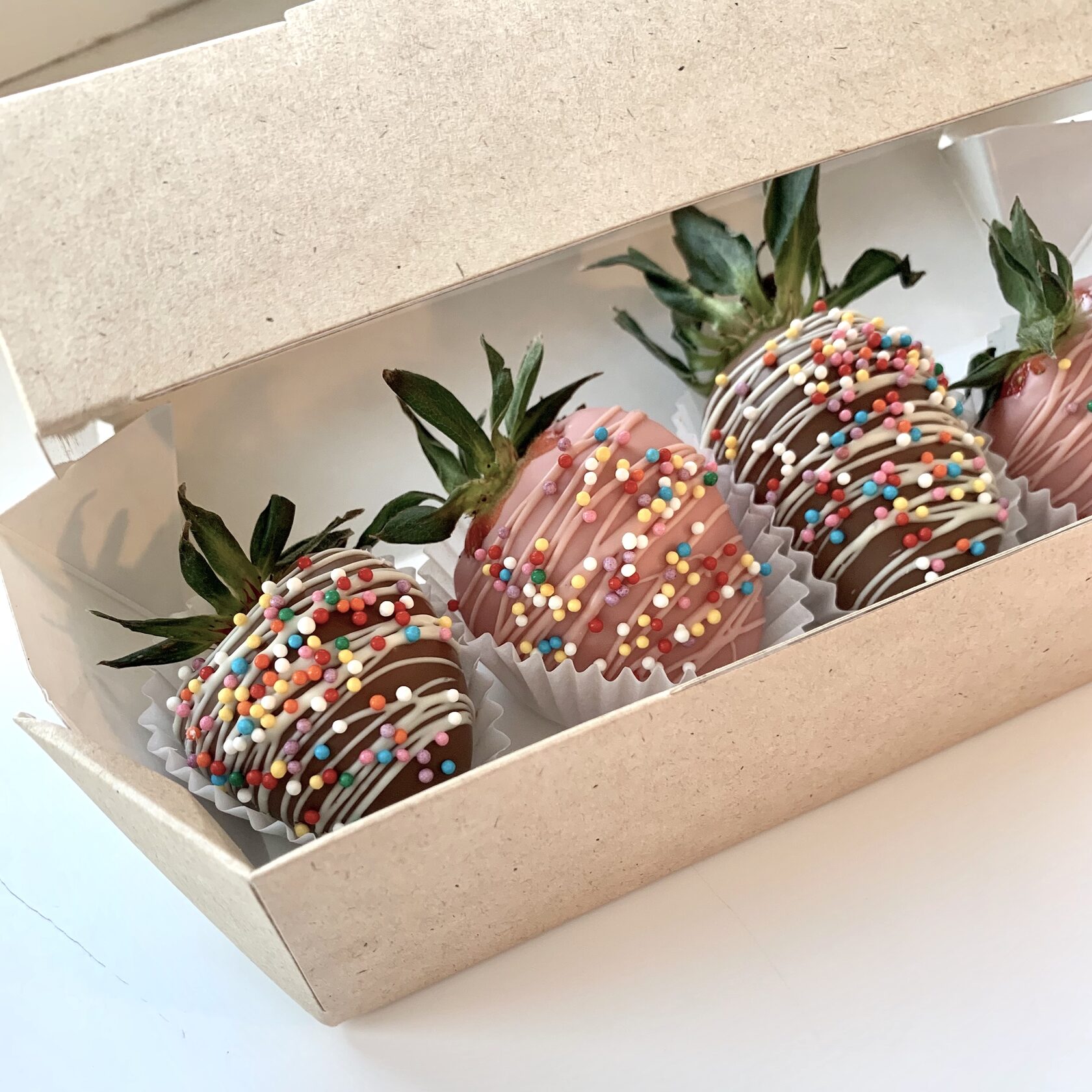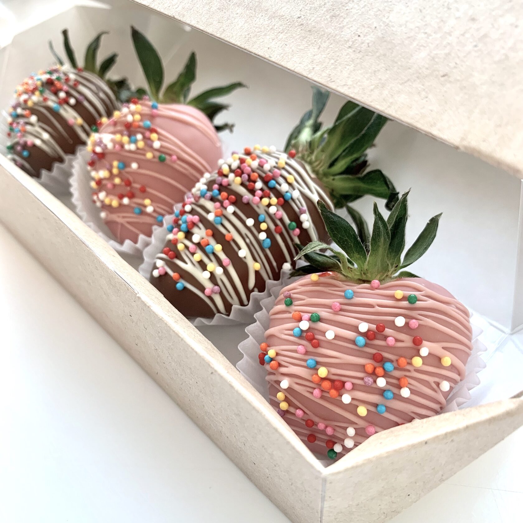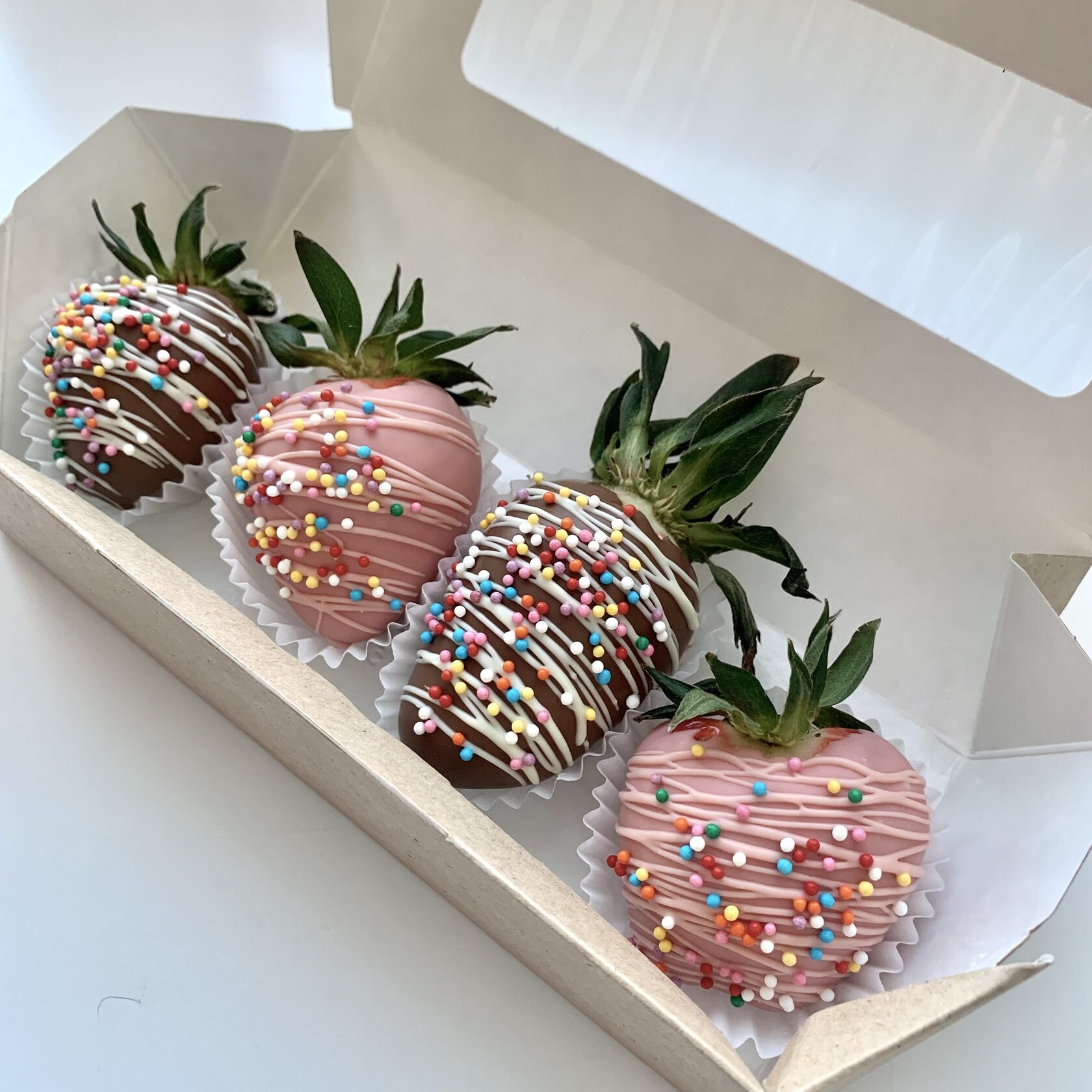 🍓в белом бельгийском шоколаде (с добавлением натурального, гипоалергенного красителя) с украшением кондитерской посыпкой (2 шт). 🍓 в молочном бельгийском шоколаде с украшением кондитерской посыпкой (2 шт).